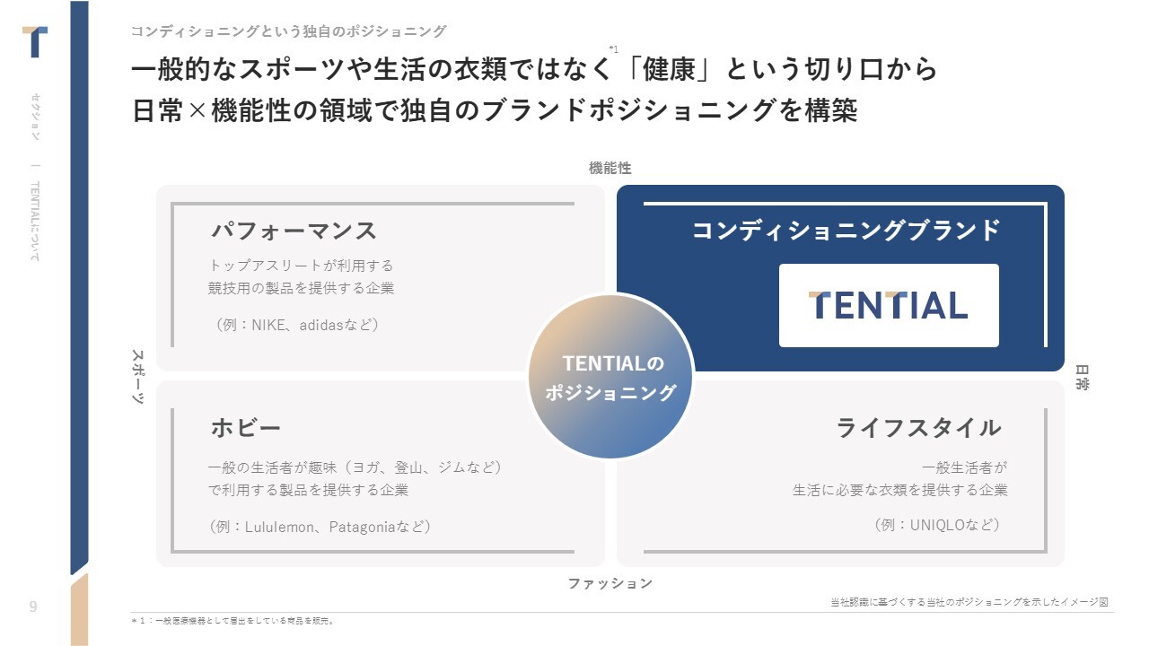 中西:消費者から見たブランドのポジショニングです。当社は、日常をテーマにして機能性を追求したブランド展開を行っています。したがって、スポーツシーンではなく、日常の「健康」という切り口から、独自のブランドポジショニングを構築しています。