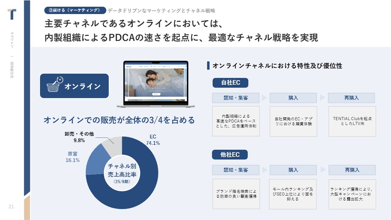 中西:当社の販売チャネルは、自社ECと他社ECを合計したオンラインが売上全体の74.1パーセントとなっており、このうち自社ECサイトの売上が大きな割合を占めています。その他、直営店舗の売上が約16パーセント、卸売などが約9パーセントとなっています。