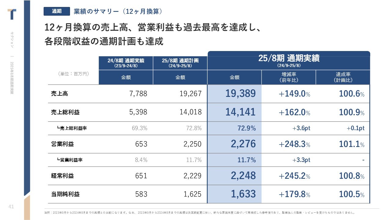 中西:2025年8月期通期の実績についてご説明します。当社は2025年度より、これまでの1月決算から8月決算に変更しています。