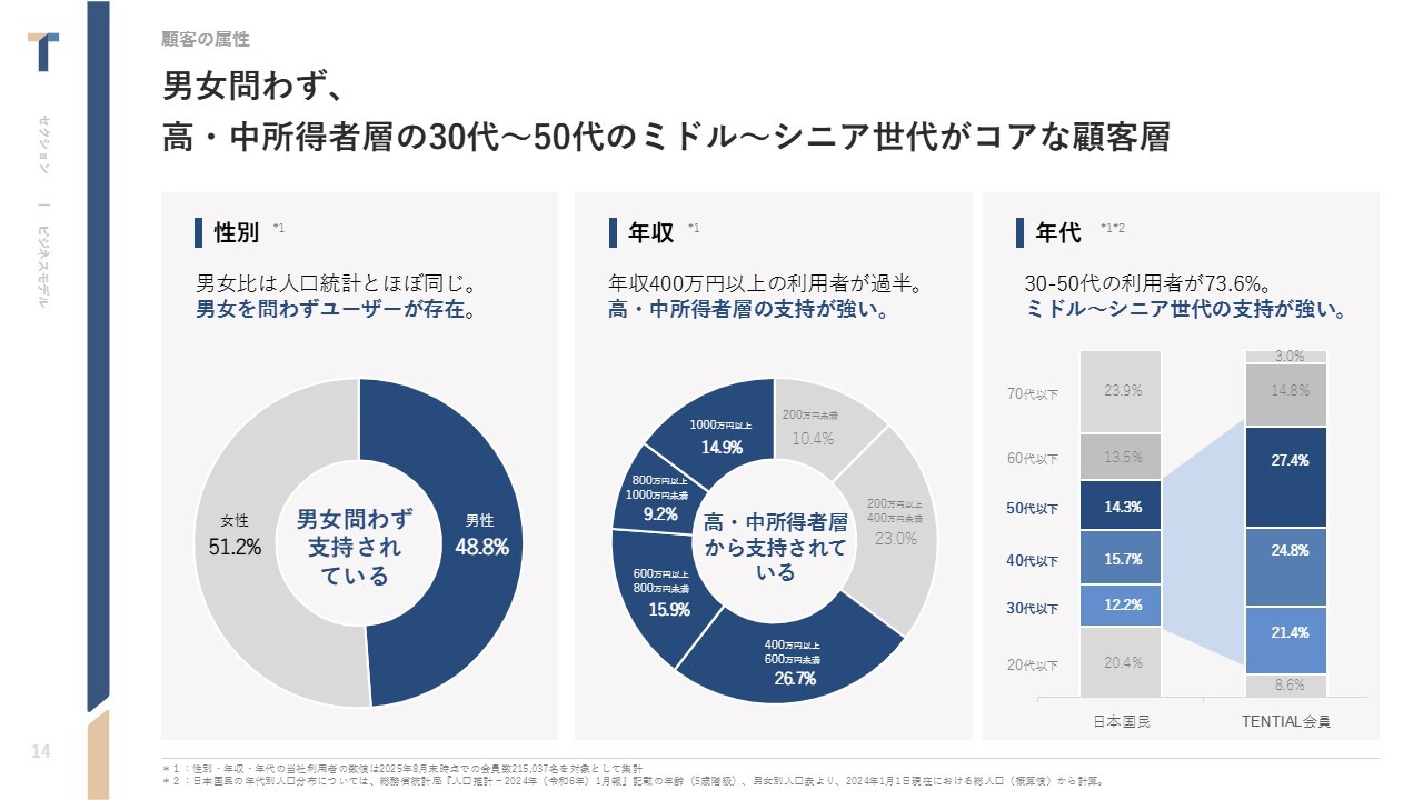 中西:お客さまの属性です。男女比はほぼ半々に分かれています。若干女性がリードしていますが、これはギフトニーズが非常に高いことが背景にあります。女性が男性に向けてプレゼントすることがあるため、女性ユーザーの比率が少し多くなっています。