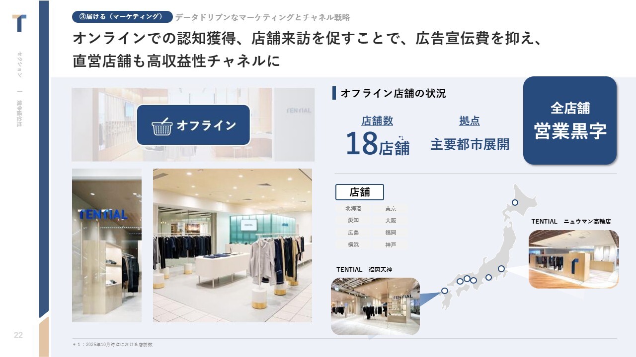 中西:オフラインは現在18店舗を展開しており、全店舗で営業黒字です。オンラインでマーケティング活動をしていますが、そこで商品を見たお客さまが「実際に触ってみたい」「試着をしてみたい」となり来店されるケースが非常に増えてきています。