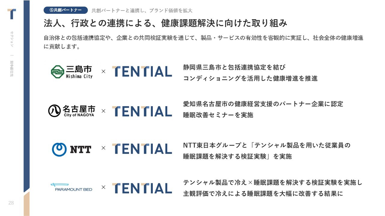 中西:現在はパジャマを販売していますが、まだ非常に大きな既存商品のマーケットがあると思っています。そこにTENTIALが培ってきたノウハウや技術力を適用しながら、今までよりも快適な商品や、コンディショニング・健康に紐づく商品を販売していくことで、大きなシェアを作っていける商品ポートフォリオを保有している企業だと考えています。