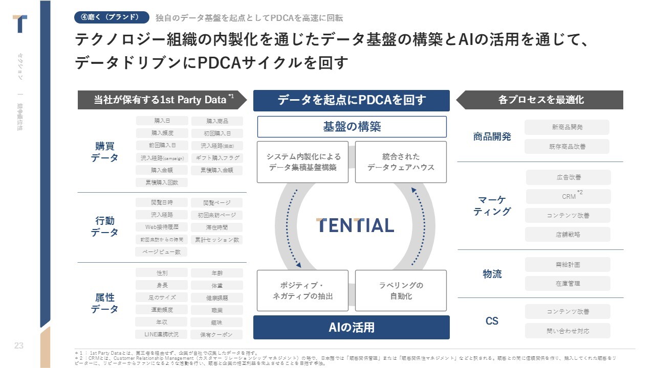 中西:データドリブンなマーケティング活動を通じて、いろいろな購買データやマーケティングデータが日々集まります。当社は社内にテクノロジー組織を設けており、データ分析体制を整えています。これにより、日々のデータを分析しながら商品開発やマーケティングに活かしていることも、大きなポイントであると捉えています。