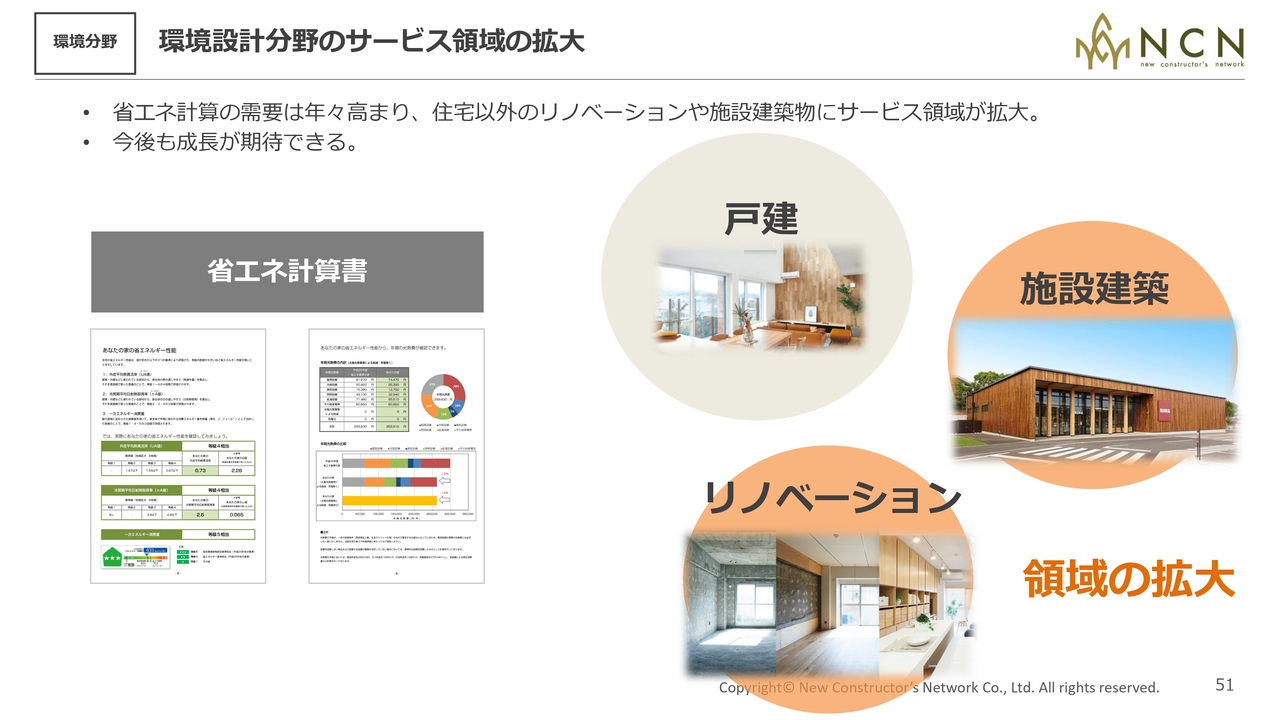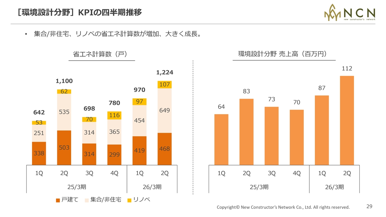 田鎖:環境設計分野のKPIです。省エネ計算数は第1四半期、第2四半期と大きく右肩上がりになっています。省エネルギー計算は今回の法改正で義務化し、すべての木造住宅は省エネルギー性能を明らかにしなければなりません。