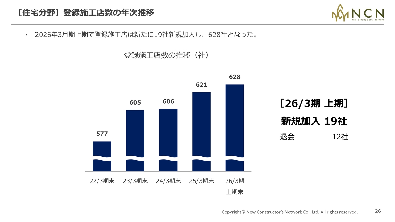 2026年3月期上期で新しく加入した会社が19社、退会した会社が12社で、差し引きで7社ほど増加しています。登録施工店は年々増加傾向となっています。