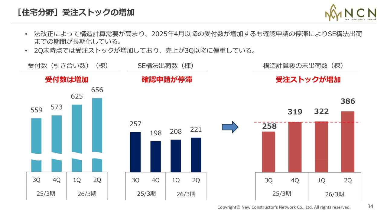 一方で構造計算出荷数は、行政手続きが長引いたために6月末あるいは9月末までに出荷できなかったものが多くありました。このため、第2四半期の9月末の時点では、通常およそ300棟前後で推移しているものが約400棟となっており、受注ストックが溜まった状態で第3四半期、第4四半期へと進んでいくことになりました。