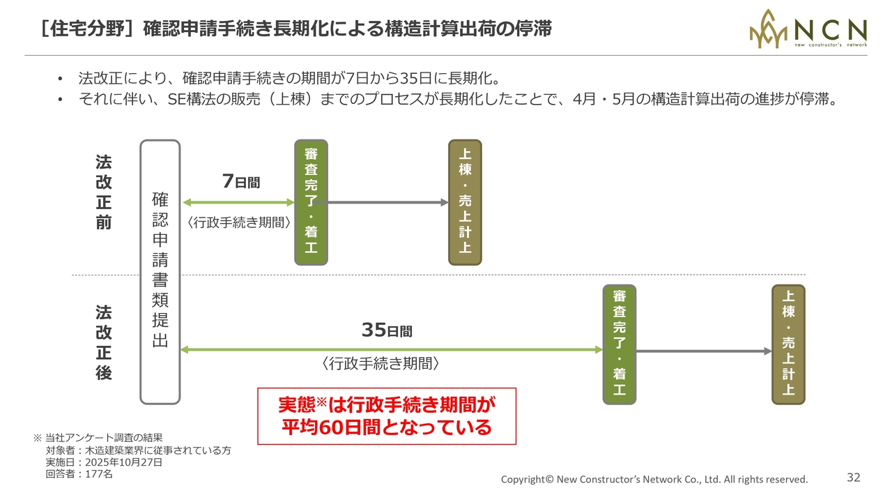 それに伴い、今まで7日間で申請が完了していたものが、35日間かかることになりました。これが最も大きな要因です。約1ヶ月分後ろ倒しになってしまったというのが、この第1四半期の構造計算書出荷数のデータに影響しています。