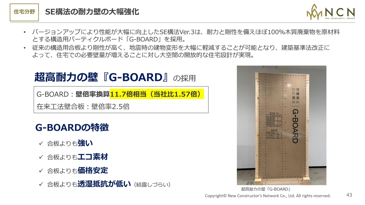 田鎖:4月に発表した最新バージョンの「SE構法Ver.3」では、今までの耐力壁の強度よりも強い、「G-BOARD」という超高耐力の壁を開発し、国から認可を得ることができました。