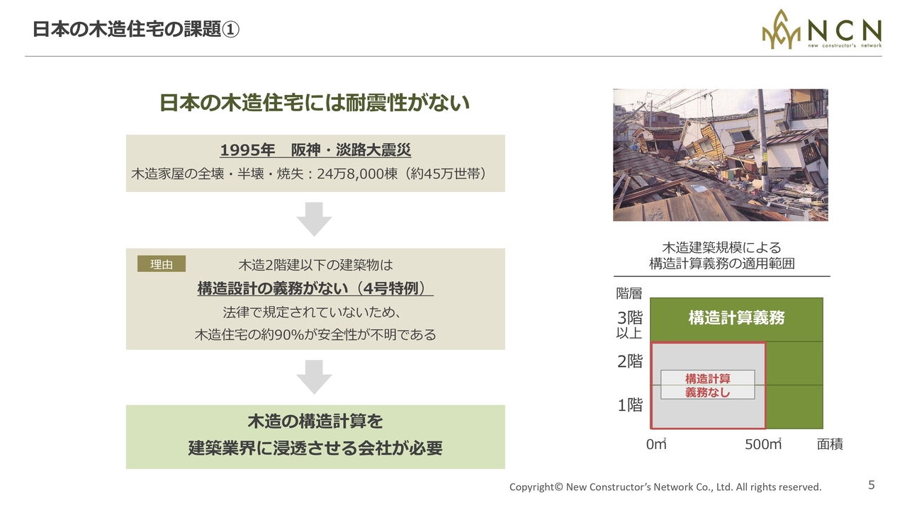当社は1996年に設立されました。その前の年に阪神淡路大震災があり、そこで多くの木造家屋が倒壊しました。その原因を調べてみると、スライド右下の図にあるように、木造2階建て以下、500平方メートル未満の建物には構造計算義務がないということがわかりました。