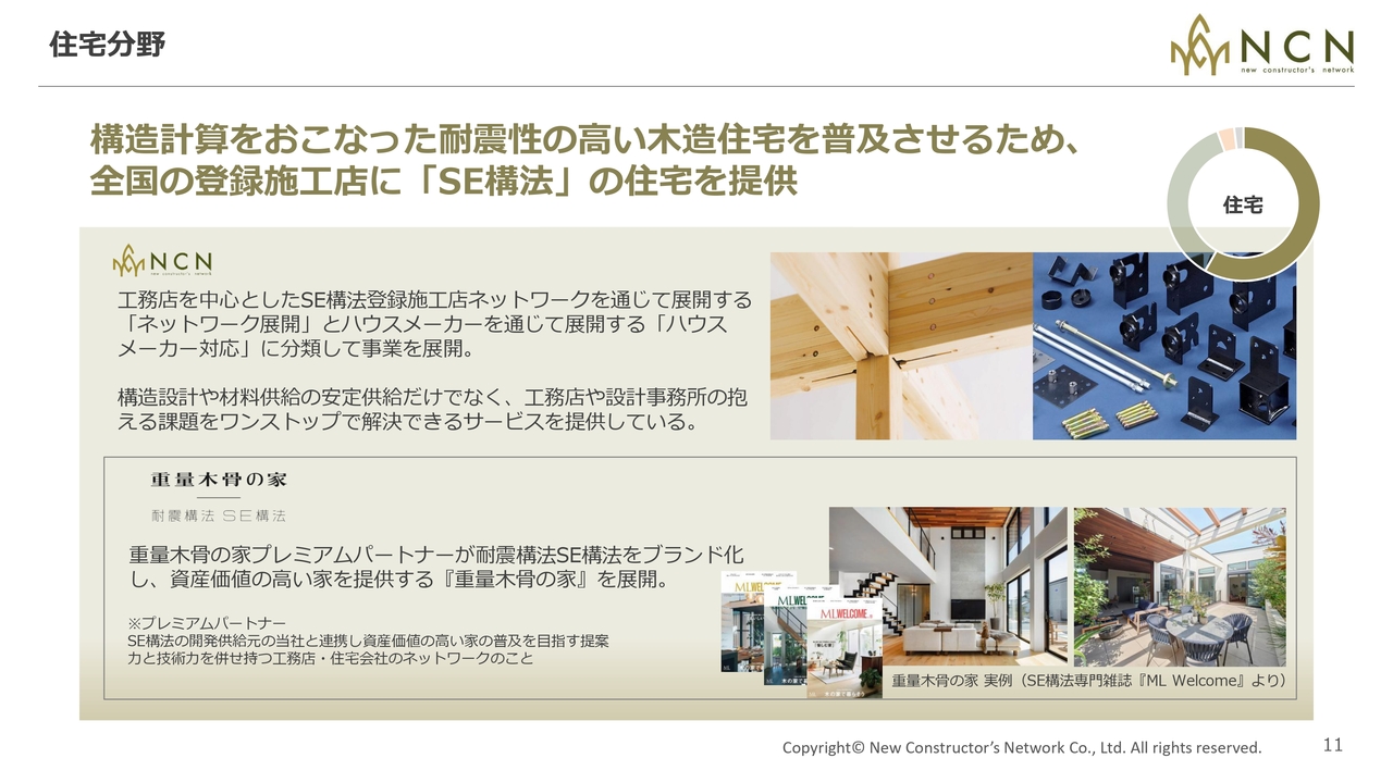 田鎖:住宅分野については、創業当時から「SE構法」というシステムを販売しています。 スライド下段に記載した「重量木骨の家」は、より資産価値のより高い住宅を提供するブランドです。当社と連携する628社の工務店・住宅会社のうち、約60社のプレミアムパートナーがこのブランドを掲げ、事業を展開しています。