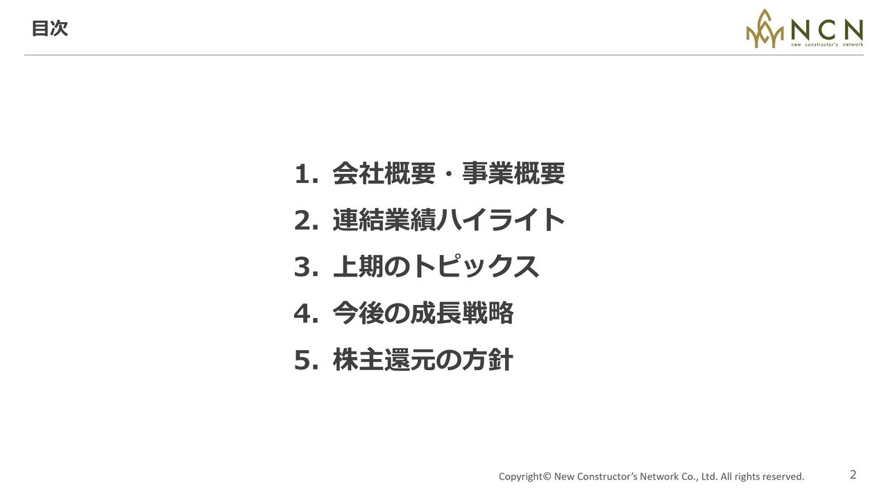 本日の内容です。会社概要・事業概要をご説明した後に、連結業績ハイライト、上期のトピックス、今後の成長戦略、株主還元の方針についてご説明します。