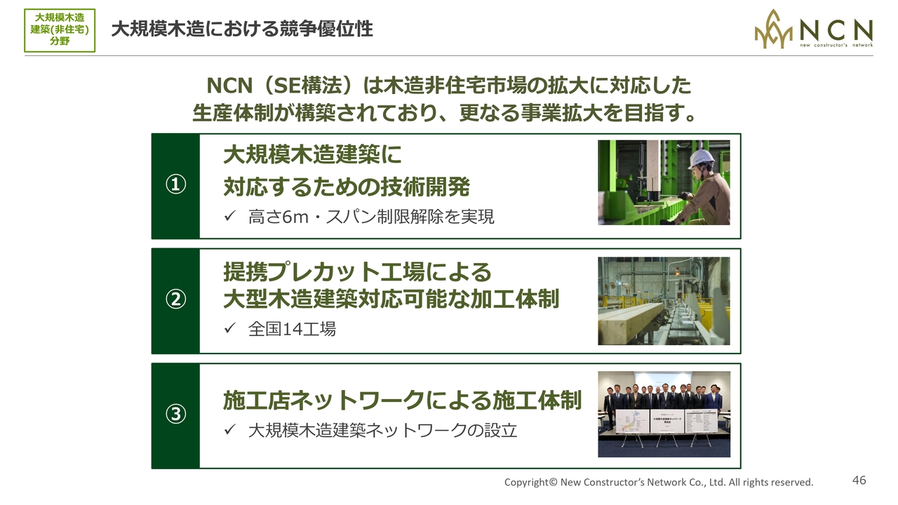 1つ目は、大規模な建築物に対応するための、より強度の高いものの技術開発です。2つ目は、大量に生産するための工場やインフラの整備です。3つ目は、先ほどご紹介した施工店のネットワークによる施工体制です。この3つを拡充していくことで、競争優位性を取っていこうと考えています。