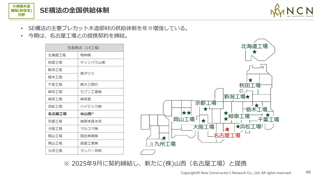 現在、「SE構法」の主要プレカット木造部材の供給体制の増強のため、工場をどんどん増やしています。今期は愛知エリアの大手である山西とも提携契約を締結しました。