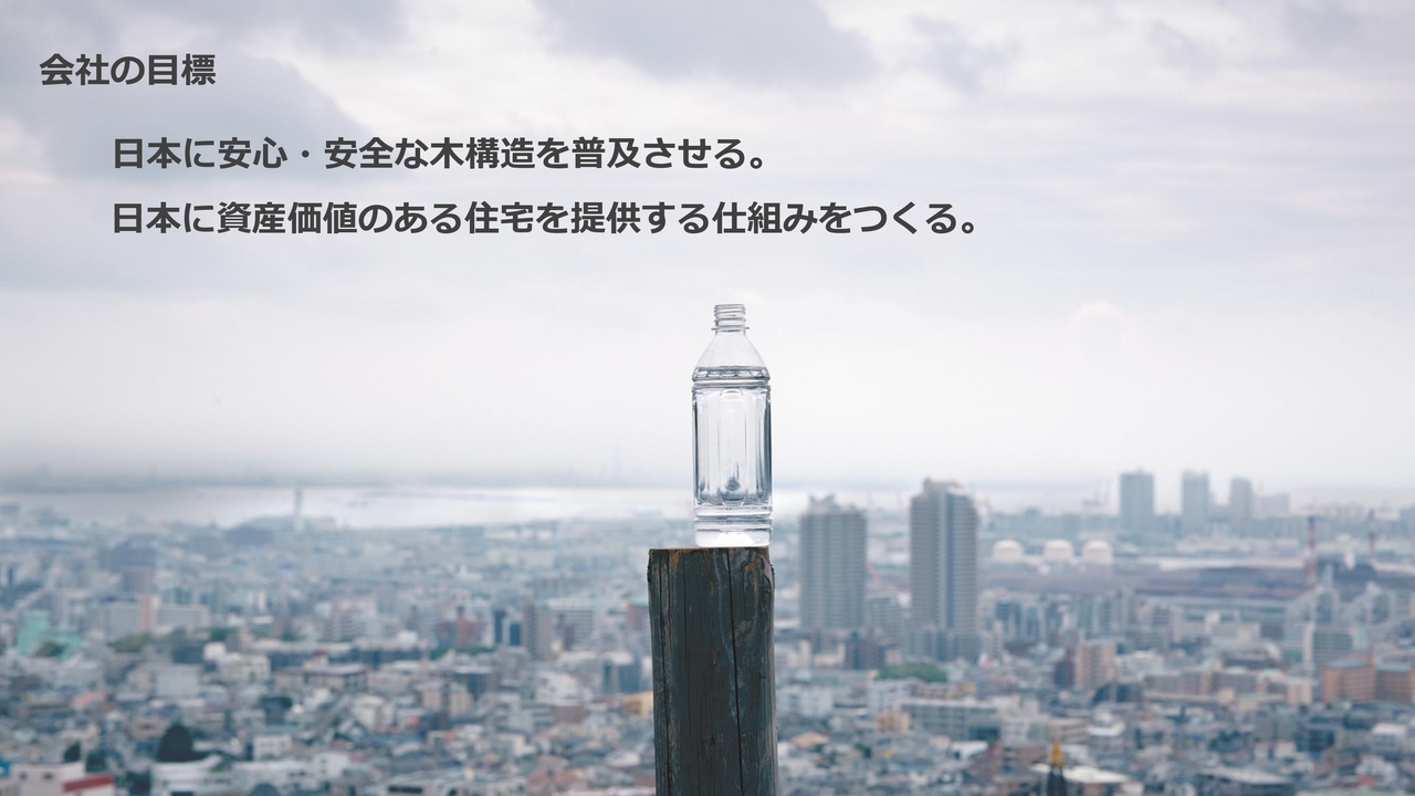 田鎖:会社の概要です。当社は「日本に安心・安全な木構造を普及させる。」と「日本に資産価値のある住宅を提供する仕組みをつくる。」の2つを目標にしています。