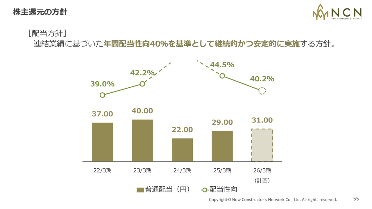 田鎖:株主還元の方針です。当社は上場以来、配当性向を40パーセントと定め、長らく配当を続けています。今後も、この配当性向を基準として、みなさまにしっかり還元するべく、業務を行っていきます。