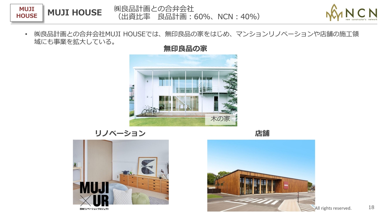 田鎖:代表的な関係会社をご紹介します。まず、良品計画との合弁会社であるMUJI HOUSEです。こちらでは「無印良品の家」という住宅を、全国の展示場を用いて展開しています。