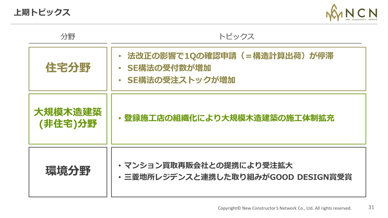 田鎖:上期のトピックスです。先ほどご説明したとおり、住宅分野では第1四半期、特に4月と5月の2ヶ月間で確認申請が停滞したことにより、売上が減少しました。一方で「SE構法」の受付数がどんどん拡大しており、受注ストックは増加しています。