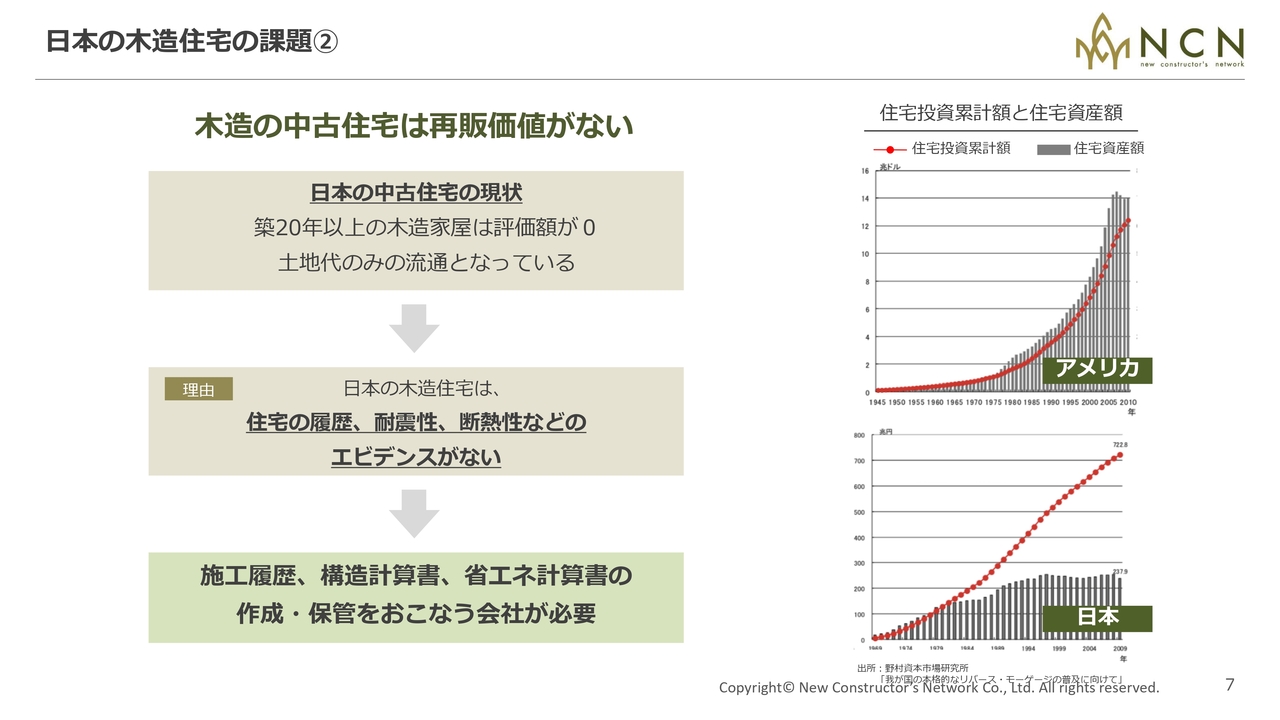 田鎖:もう1つの課題として、日本の木造住宅は、中古になると価値がなくなってしまうという現実がありました。現在もそうですが、木造で建てられたものは10年、20年経つと建物の評価額がゼロになり、土地の価格だけで売買されています。