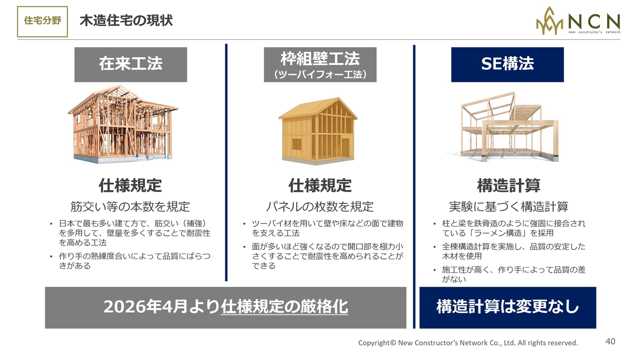 田鎖:構造の審査が始まり、それが厳格化されるという2段構成の法改正の中で、当社の登録施工店が実際に施工しているものに関しては、実は「在来工法」がまだ多く利用されています。