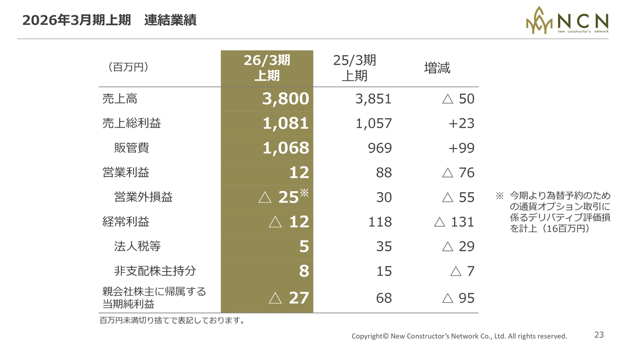 田鎖:2026年3月期上期の連結業績ハイライトについてご説明します。売上高38億円、売上総利益10億8,100万円、営業利益1,200万円、経常利益はマイナス1,200万円となっています。
