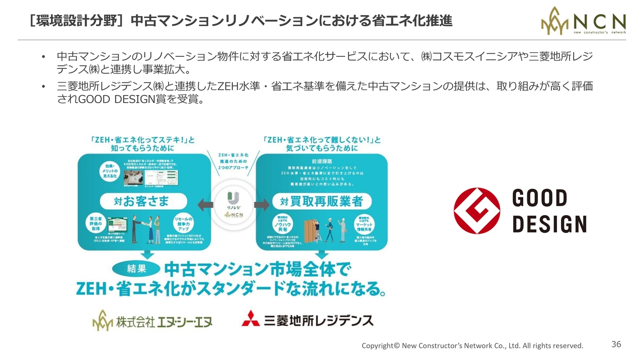 環境設計分野では、2本のプレスリリースも行いました。大手マンション買取再販会社との業務提携による受注の拡大、および、三菱地所レジデンスと連携した取り組みが「GOOD DESIGN賞」を受賞しました。