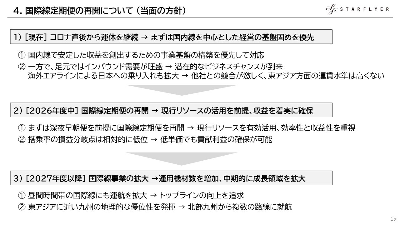 2027年3月期中に国際線定期便を再開し、その後は国際線事業の拡大を考えていく方針です。トップラインを上げていくためには、やはり昼間時間帯での国際線の運航が必要なため、おそらく運用機材数を増やすことになるかと思います。