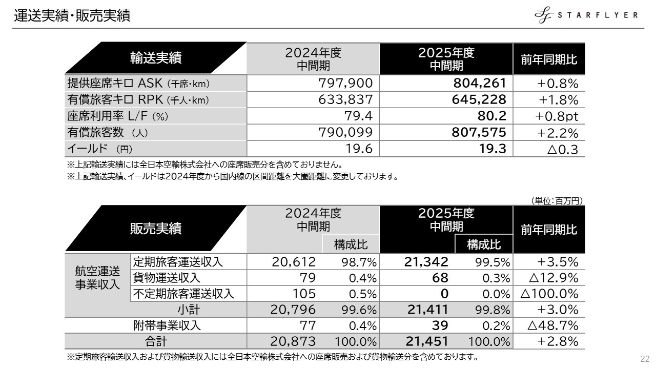 町田:運送実績と販売実績です。輸送実績では座席数、いわゆる提供座席キロ ASK(Available Seat Kilometers)が前年同期比プラス0.8パーセント、有償旅客キロ RPK(Revenue Passenger Kilometers)が前年同期比プラス1.8パーセントとなっています。また、座席利用率 L/Fは80.2パーセントと、8割を超えています。これらのデータから、旅客需要が堅調であることをご確認いただけると思います。