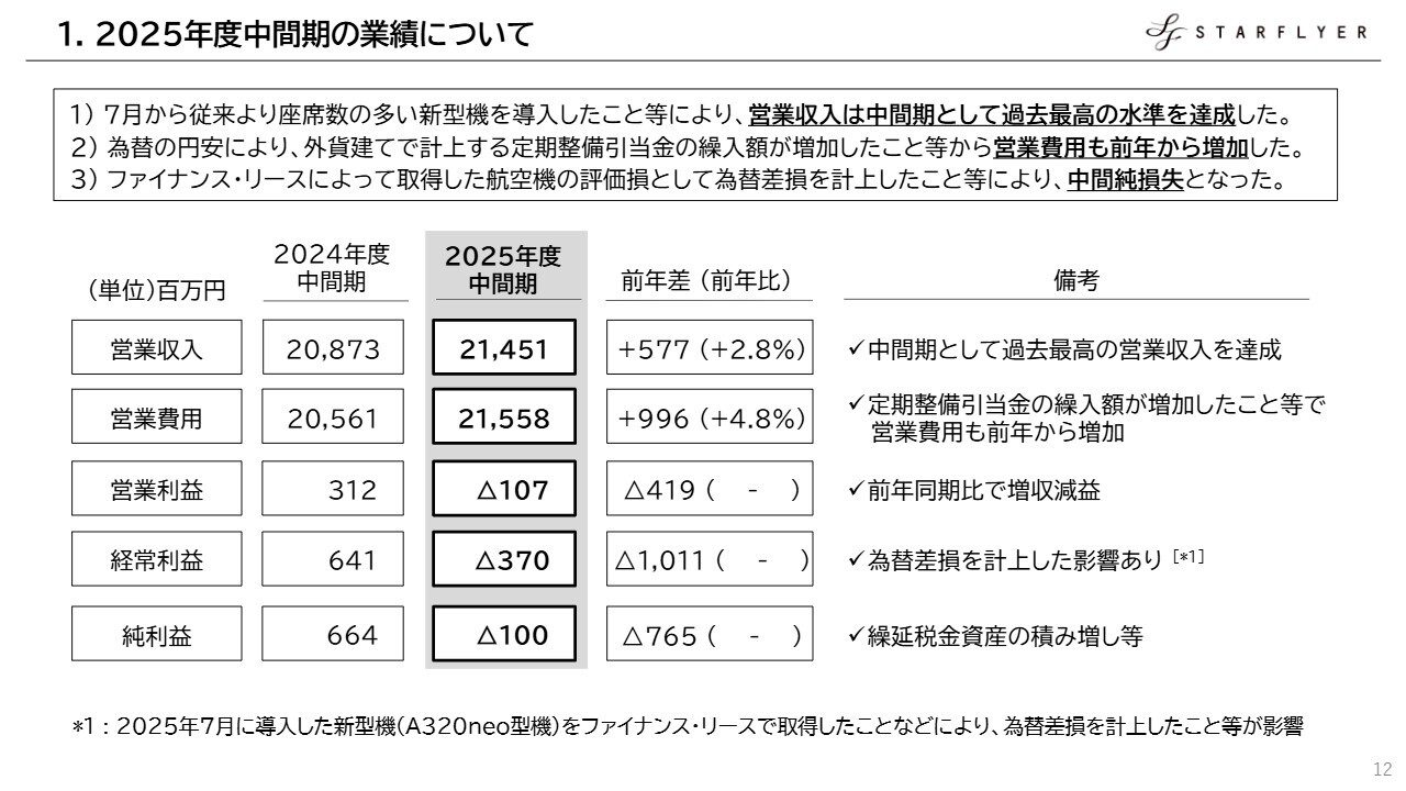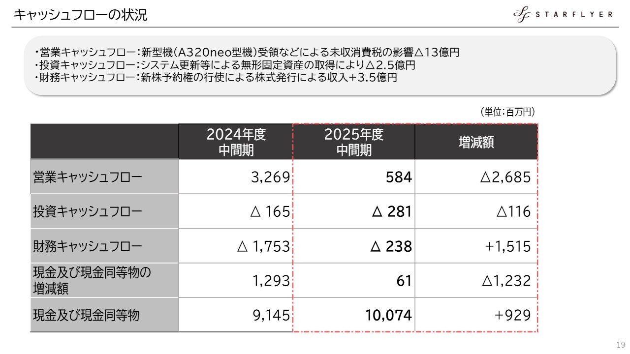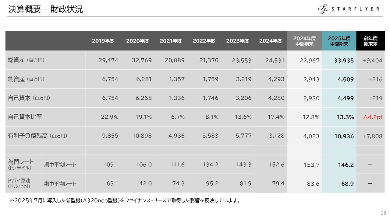 営業費用の増加については、高額整備やエンジン整備などの将来的な発生に備えて引き当てている定期整備引当金繰入額の増加が要因であり、実際のキャッシュアウトを伴わないものです。また、7月に導入した新型機(A320neo型機)は、オペレーティング・リースではなくファイナンス・リースで取得したことにより、帳簿上は自社購入と同様に資産として計上されます。リース資産は円建てなのに対し、リース負債はドル建てになるため、評価損として為替差損を計上したことが影響しました。