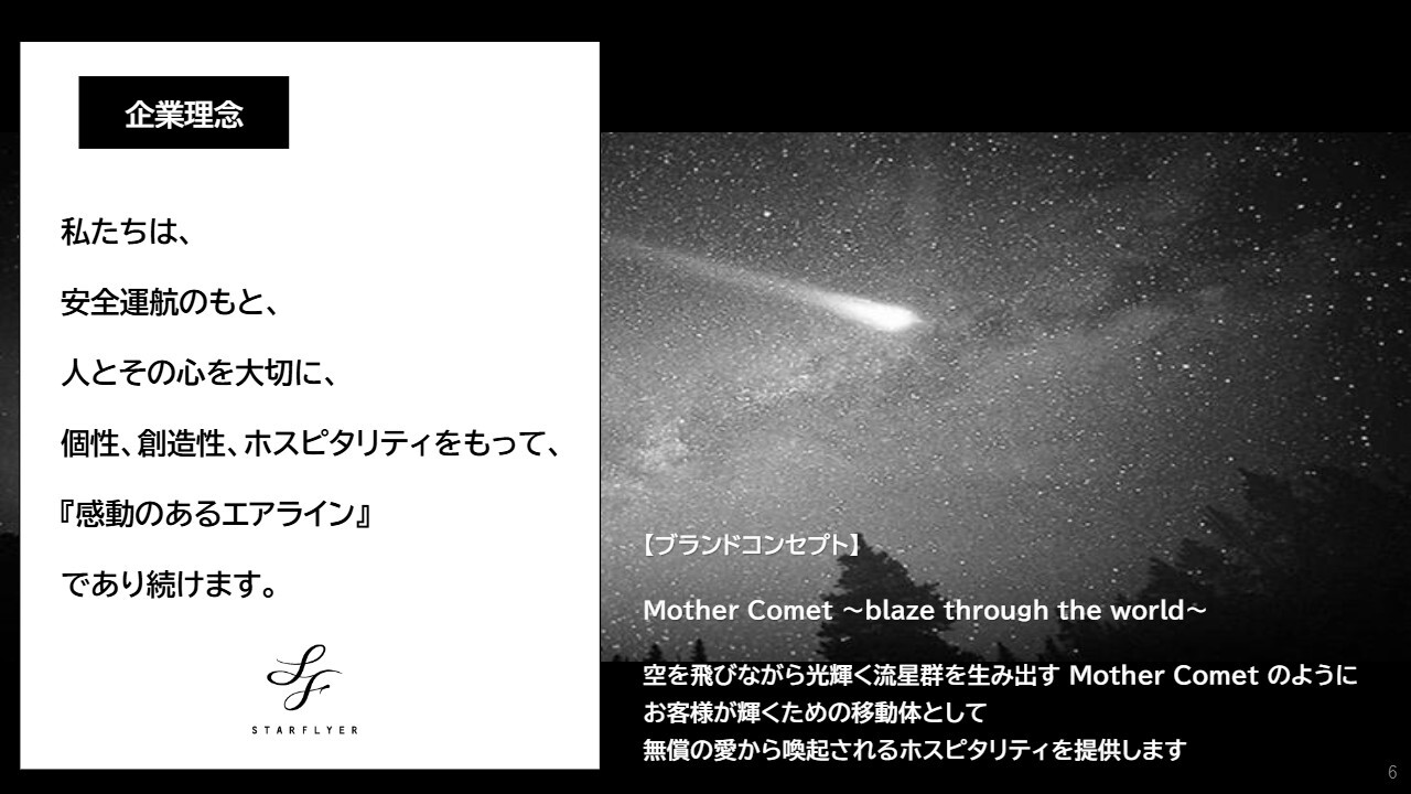 町田:企業理念とブランドコンセプトについてです。「私たちは、安全運航のもと、人とその心を大切に、個性、創造性、ホスピタリティをもって、『感動のあるエアライン』であり続けます。」を企業理念に掲げ、「感動のあるエアライン」を実現するために、私をはじめ、従業員一人ひとりが日々活動しています。