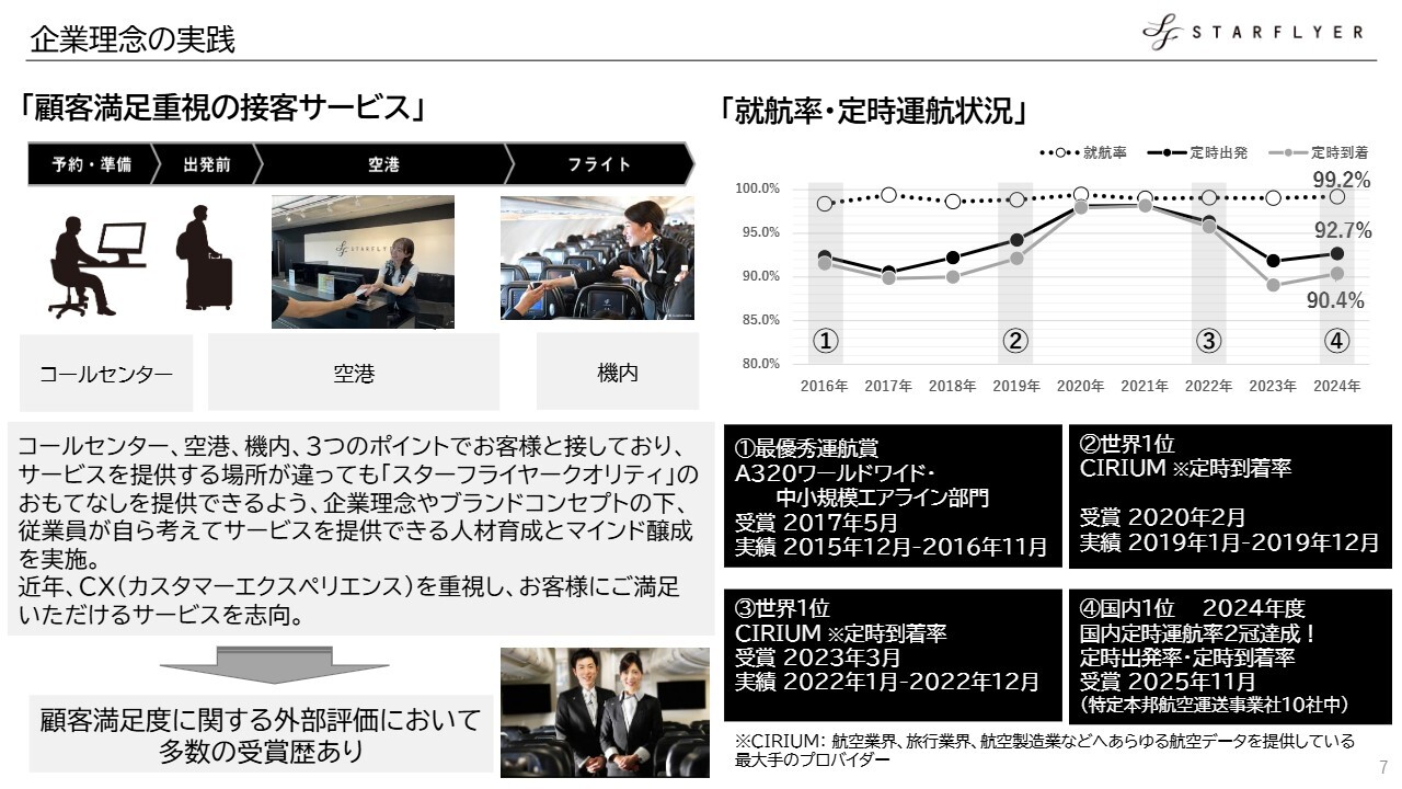 なお、右側には就航率・定時運航状況や受賞実績を記載しています。