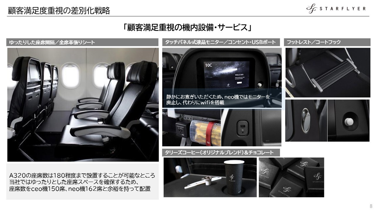 町田:ブランドコンセプトに従って、顧客満足度重視の差別化戦略をどのようにしているかについてご説明します。機内は黒を基調に統一し、革張りの座席で、他の航空会社よりも広めのシートピッチとなっています。Airbus A320型機という飛行機を利用していますが、180席まで設置可能な仕様であるのに対して当社は150席とし、シートピッチをゆったりと取って座席スペースを確保しています。ceo型機と呼んでいる旧型機は150席、若干広くなったneo型機は162席と、余裕をもって配置しています。