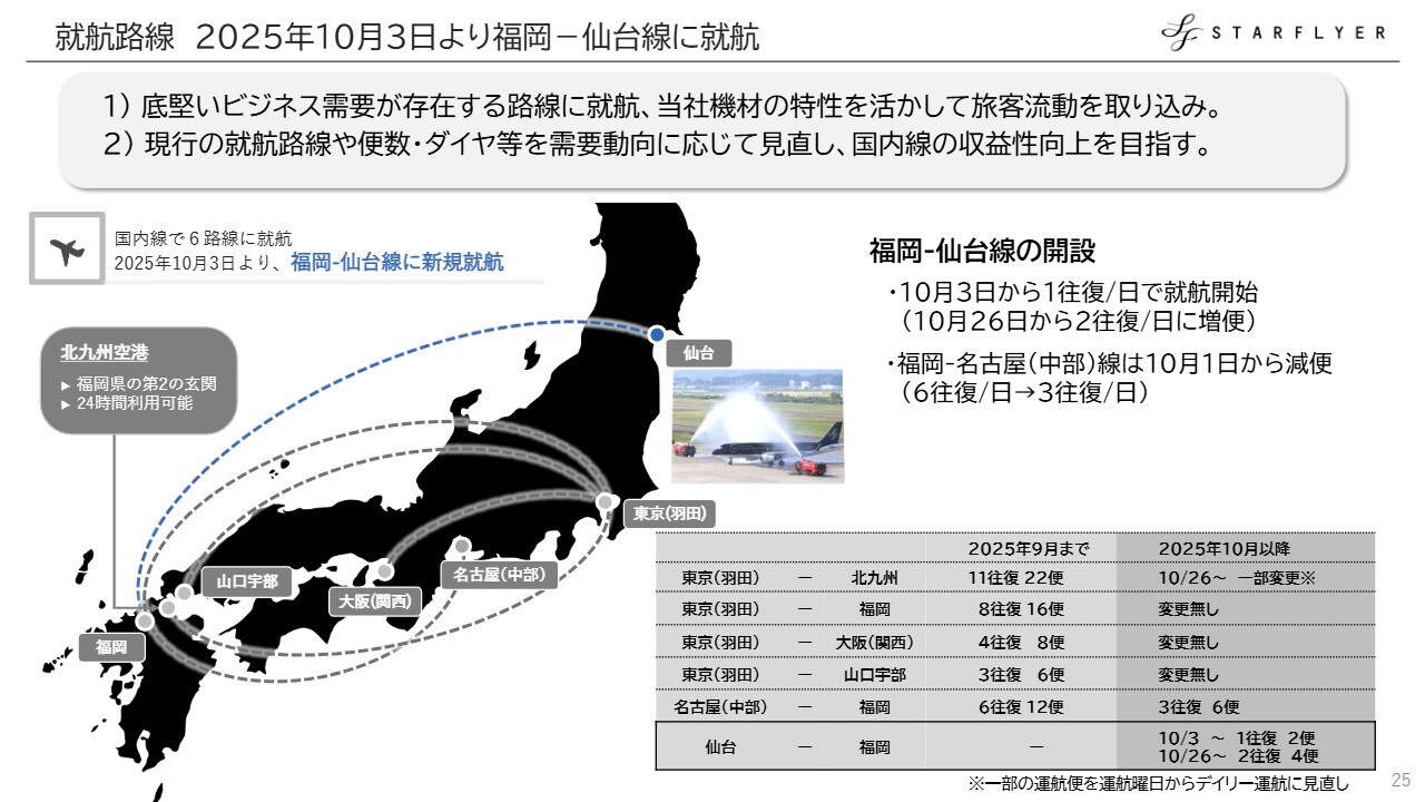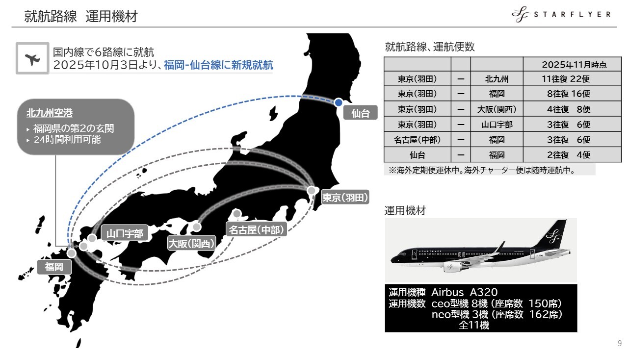 運航路線は、左側の日本地図に示したとおりです。就航路線と運航便数は右上の表をご覧ください。1点補足すると、青色で記載しているとおり、10月3日から福岡ー仙台線に新規就航しています。