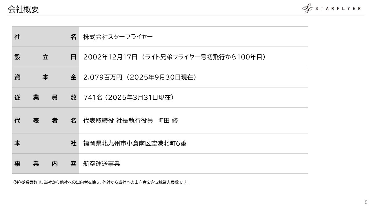 町田修氏(以下、町田):みなさま、こんにちは。株式会社スターフライヤー代表取締役社長執行役員の町田です。本日は、当社の2026年3月期中間期の決算説明会・IR説明会をご視聴いただき、誠にありがとうございます。
