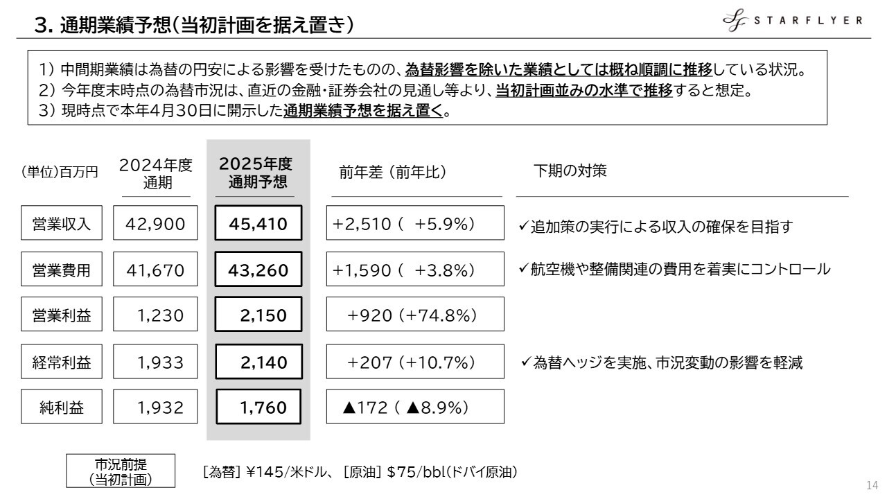なお、為替については、現在非常に不安定であることから金融機関などの予想を参考にし、当初計画である1ドル145円並みの水準で推移すると想定しております。中間期決算もそうでしたが、ドル建ての定期整備引当金とリース債務が、前期末の為替水準にどうしても左右されてしまいますが、1ドル145円と想定することで通期予想は達成できると考えています。