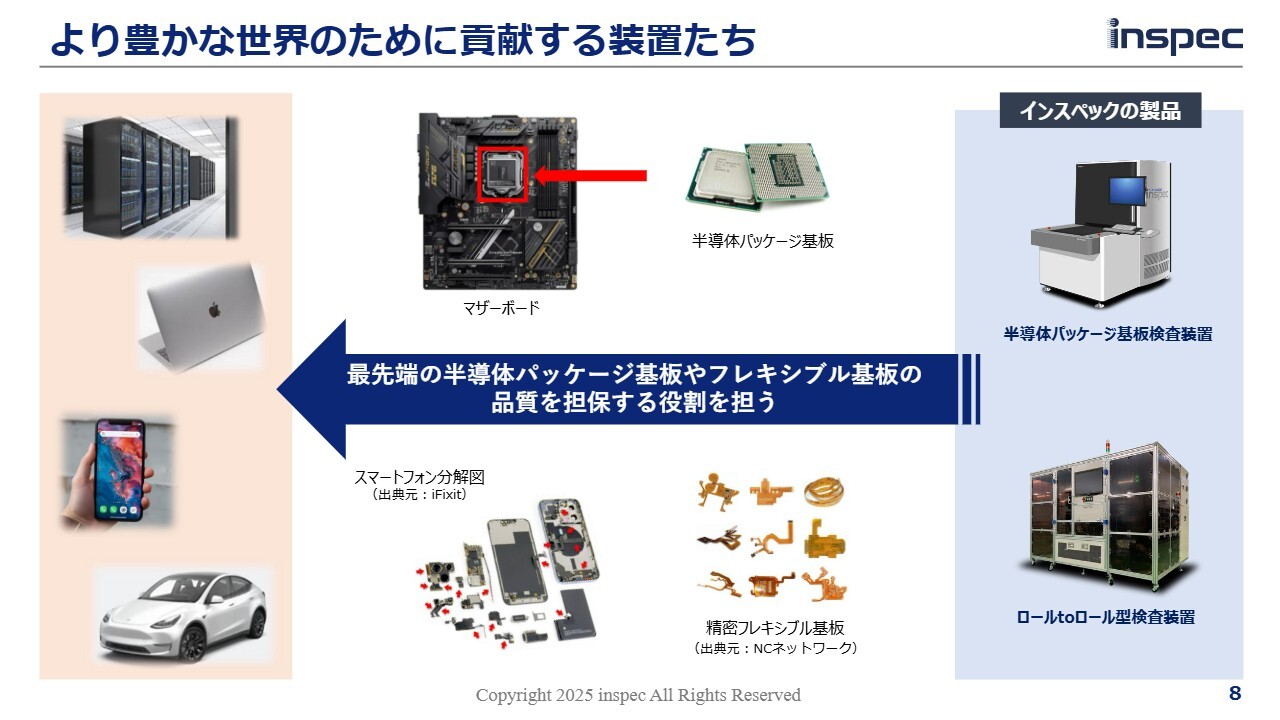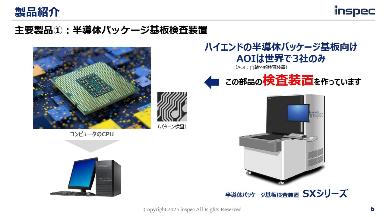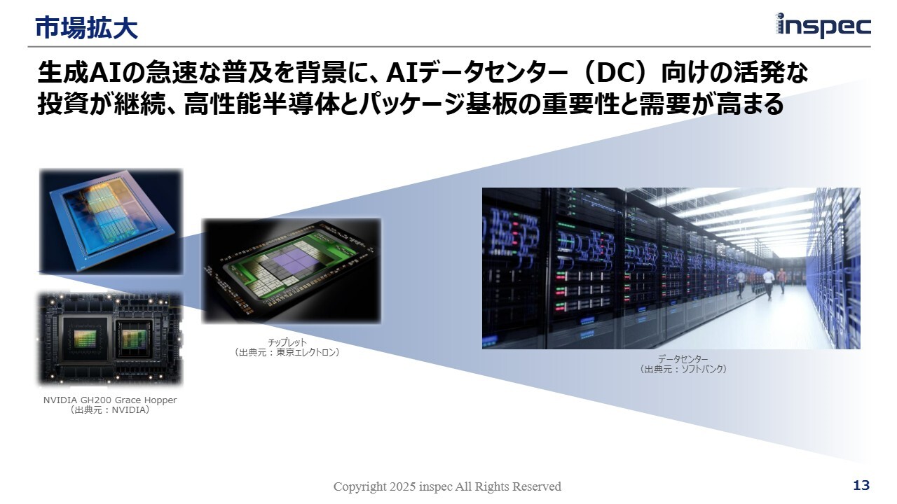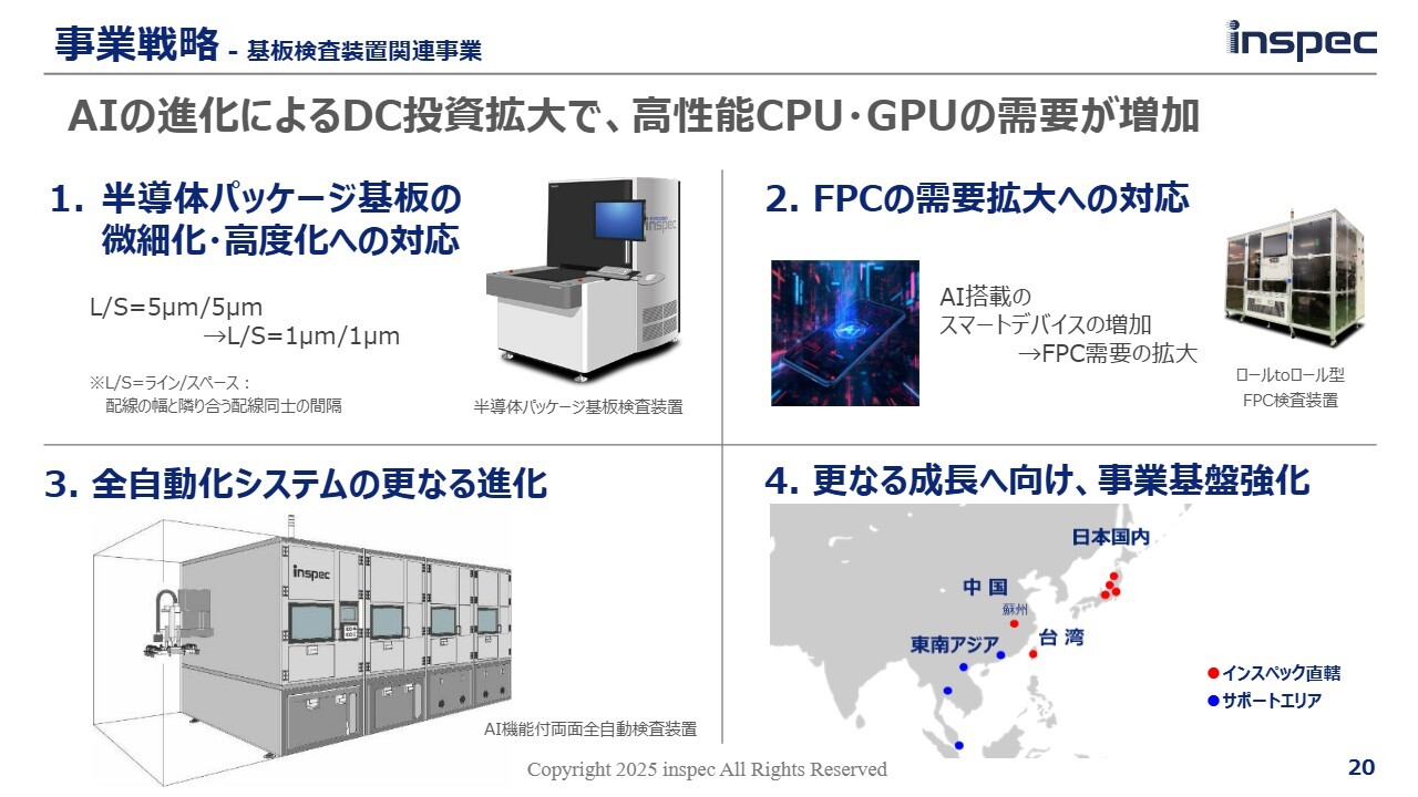 特に半導体パッケージ基板は、もともとコンピューターのCPU向けが主要なマーケットでしたが、最近ではAIやデータセンター向けの半導体生産量が著しく伸びています。それに伴い、このような用途の高性能検査装置の需要が非常に増加しており、受注も大幅に伸びているという大きな流れが生じています。