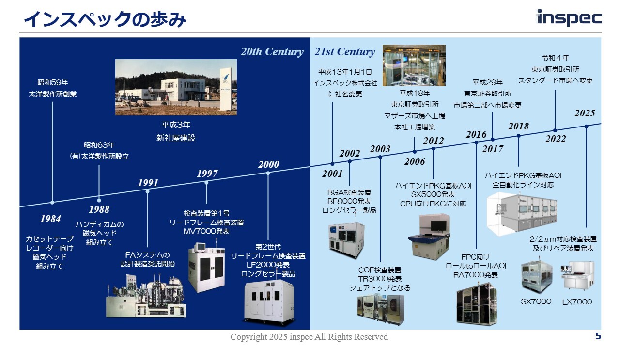 菅原:当社の歩みについてご説明します。当社は1996年に検査装置事業を開始し、1997年には半導体のリードフレームという部品向けの検査装置を発表しました。