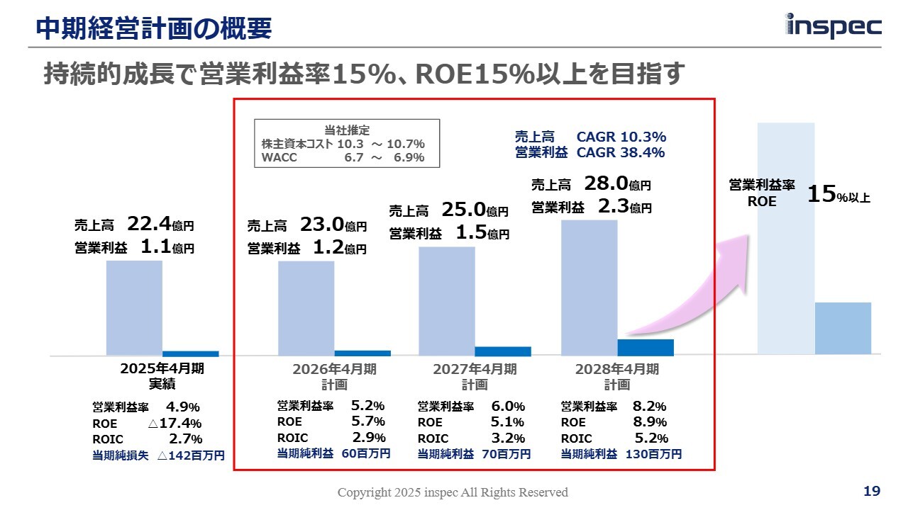 菅原:中期経営計画の概要についてご説明します。今期は売上高23億円、営業利益1億2,000万円、来期は売上高25億円、営業利益1億5,000万円、2028年4月期は売上高28億円、営業利益2億3,000万円となる見通しです。