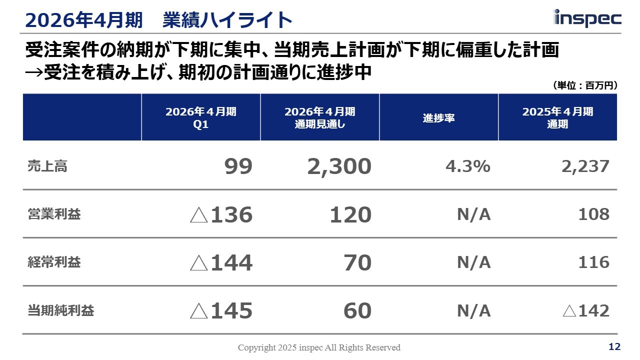 菅原:今期の業績ハイライトです。2026年4月期の売上高は23億円、営業利益は1億2,000万円となっています。売上に対する装置の受注については、ほぼ100パーセントすでに受注済みであり、第3四半期から第4四半期にかけて順次装置を出荷していく状況です。