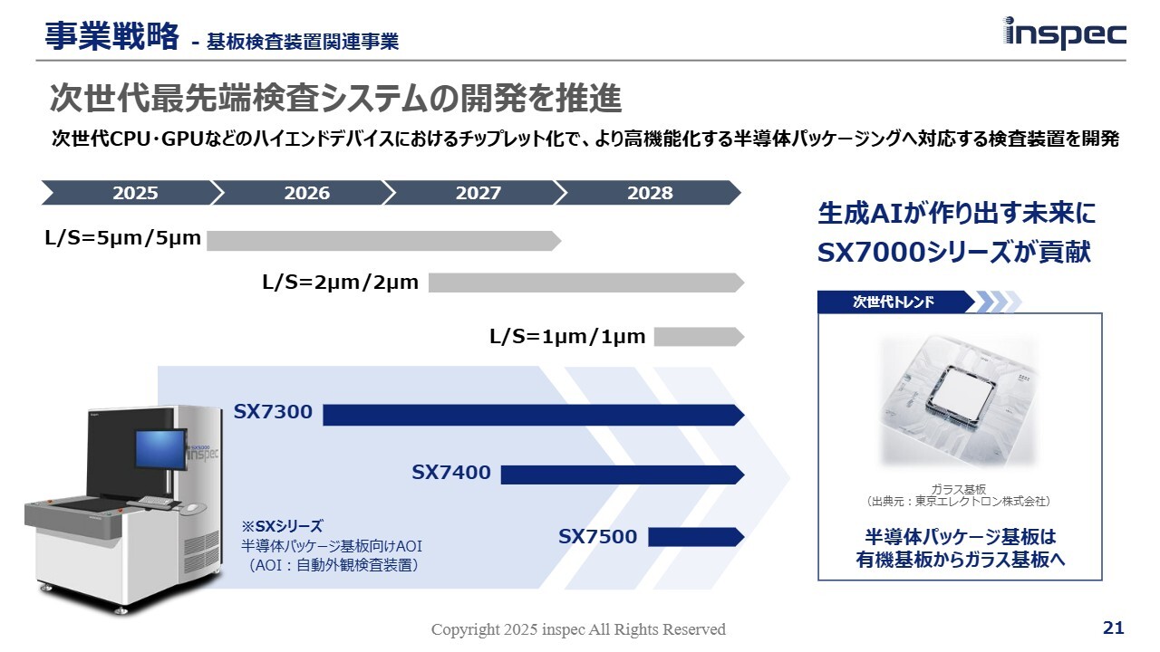 従来は樹脂基板、いわゆる有機基板をベースに配線板を製造していましたが、今後はこのベースが樹脂ではなくガラス基板に変わると考えられています。また、配線パターンも、当社が現在検査している1.5ミクロンから、1ミクロン、さらにはサブミクロンのパターンへと進展するだろうと言われています。