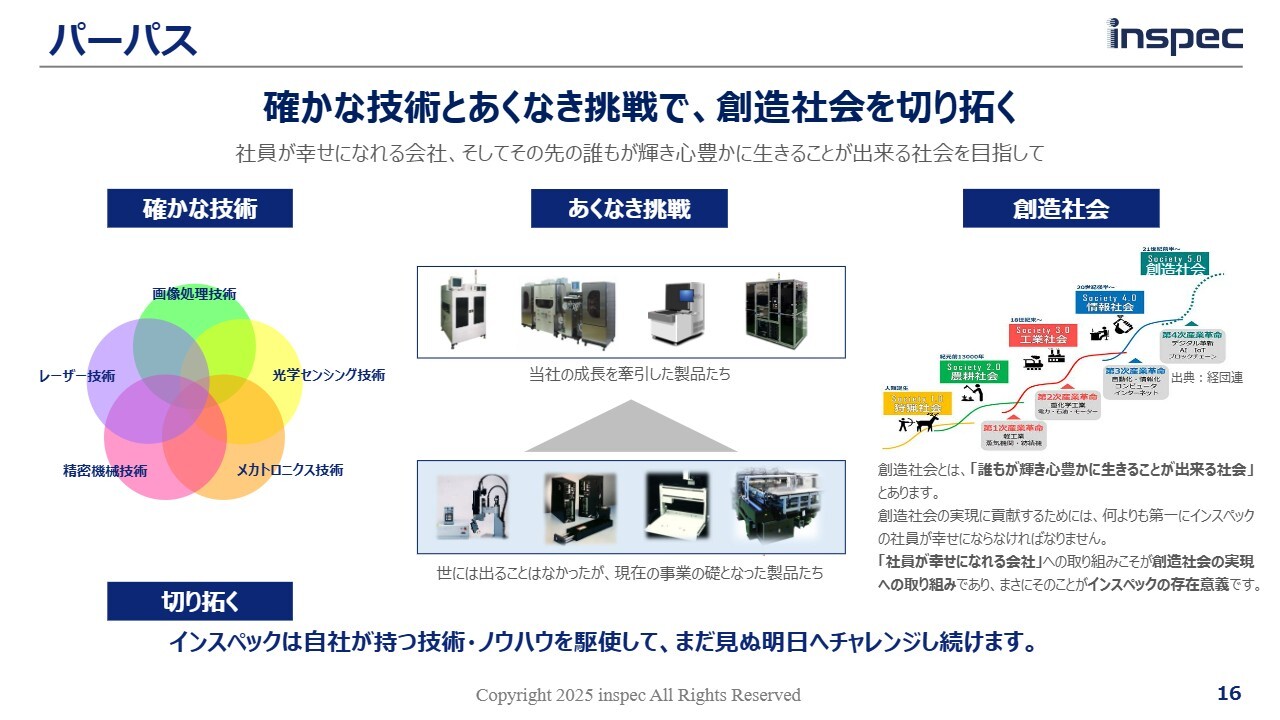 菅原:中期経営計画についてご説明します。当社のパーパスは「確かな技術とあくなき挑戦で、創造社会を切り拓く」であり、特に「挑戦」というキーワードを創業時から大切にして取り組んできました。