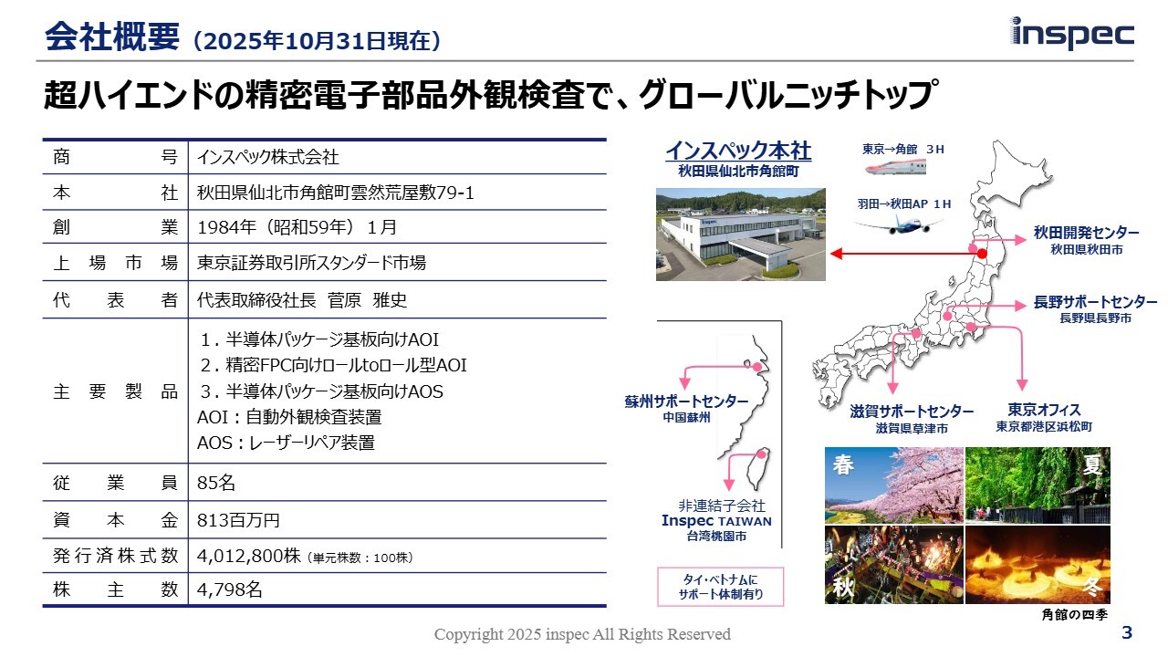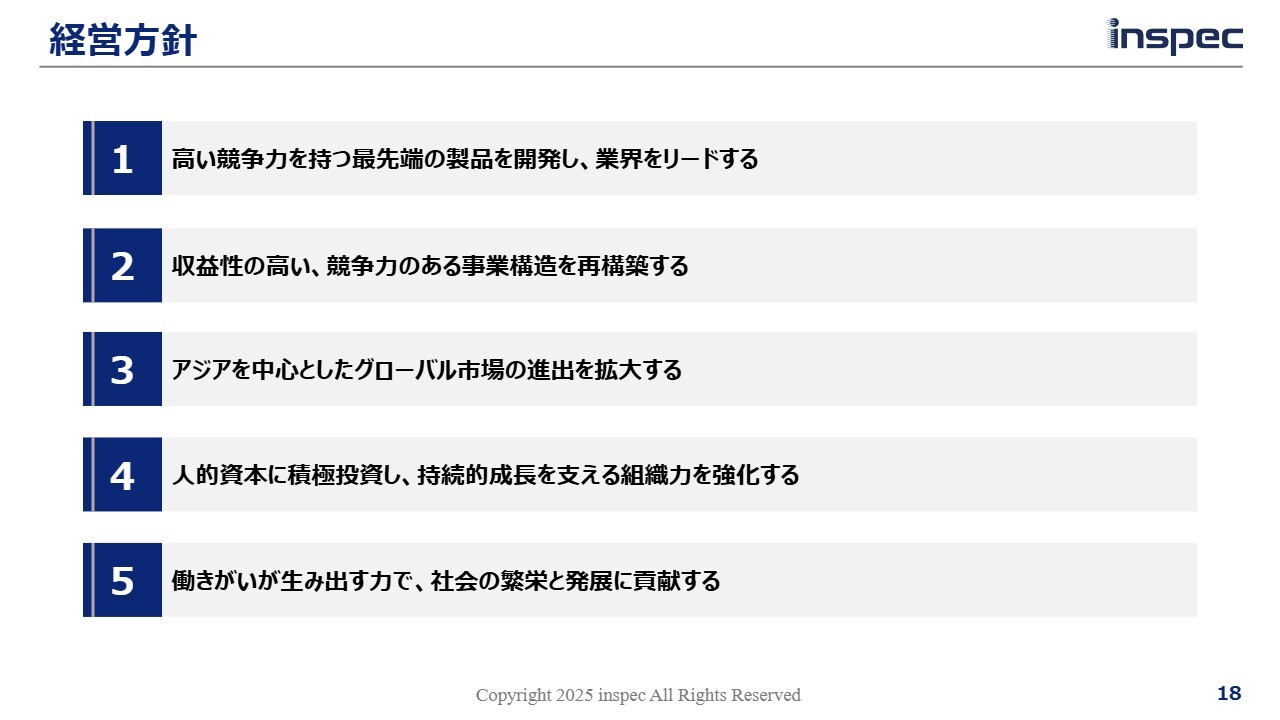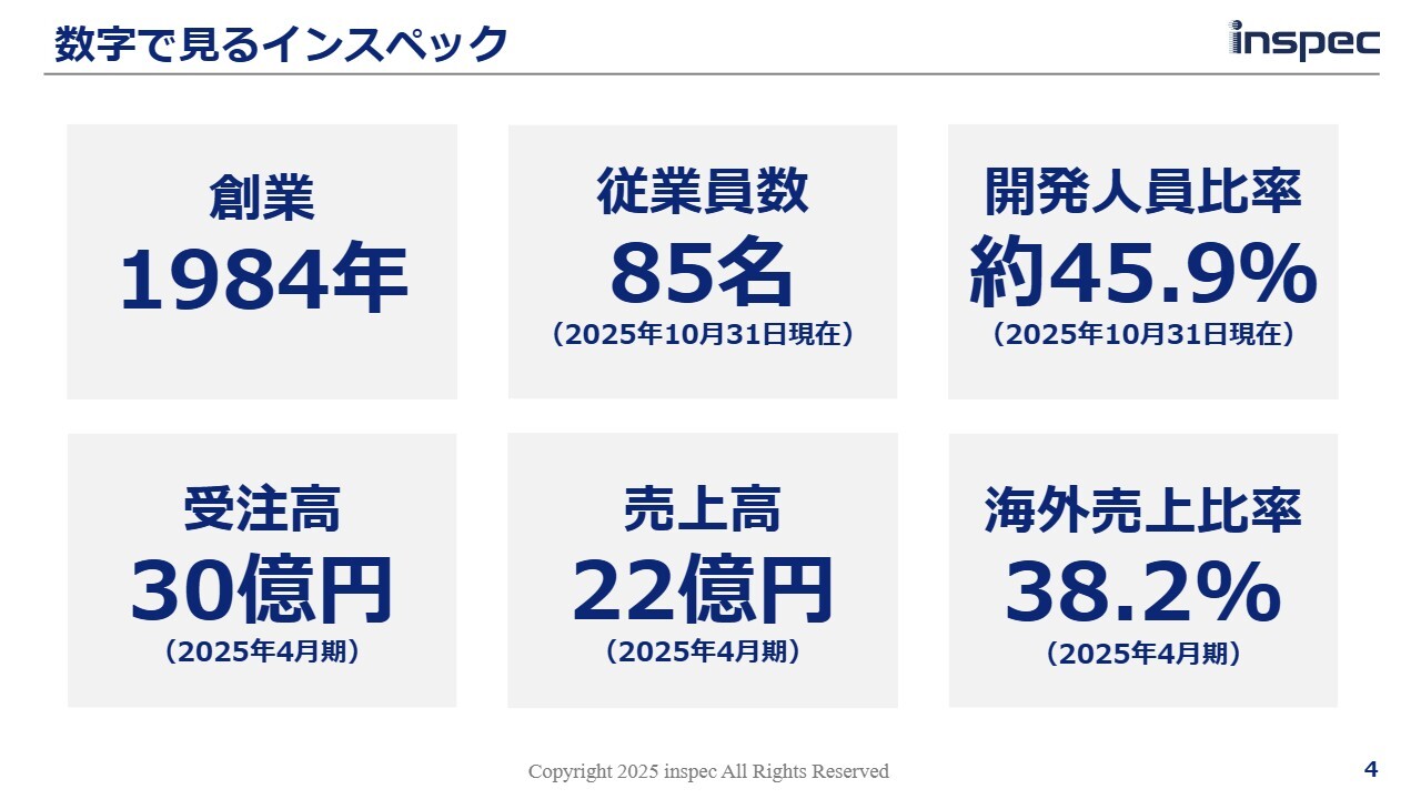 菅原雅史氏(以下、菅原):インスペック株式会社代表取締役社長の菅原です。よろしくお願いします。本日は、会社概要、中期経営計画、本日のまとめの順にご説明を進めます。