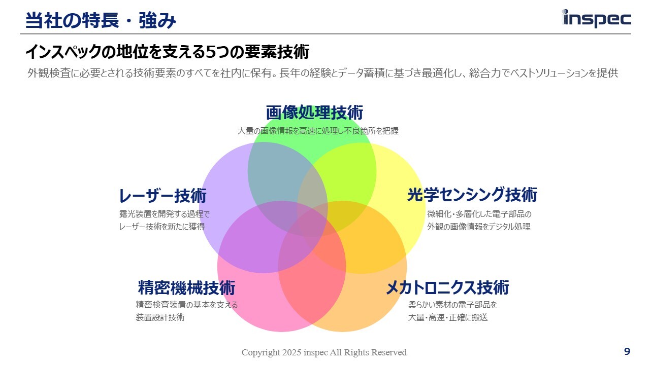 特に開発においては、半導体パッケージ基板およびフレキシブル基板の検査に必要な要素技術をすべて社内で保有しています。具体的には、画像処理技術、光学センシング技術、精密機械技術などです。