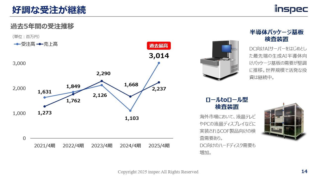 【QAあり】インスペック、主力・半導体パッケージ基板検査装置は生成AIの成長を捉え需要急拡大 25年4月期は過去最高の受注高