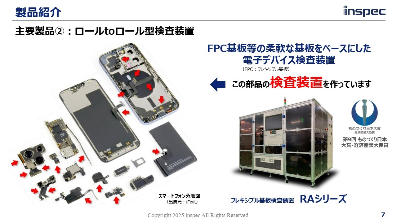 菅原:もう1つの主要製品は、精密なフレキシブル基板を検査する検査装置です。この製品の主なお客さまは、スマートフォン向けのフレキシブル基板を製造している大手メーカーです。
