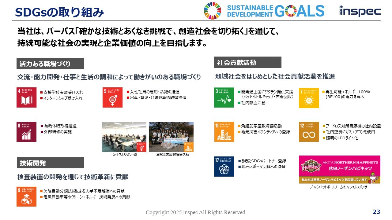 菅原:インスペックはSDGsへの取り組みに非常に力を入れています。まず、地元のバスケットボールチーム「秋田ノーザンハピネッツ」のスポンサーとなり、応援しています。