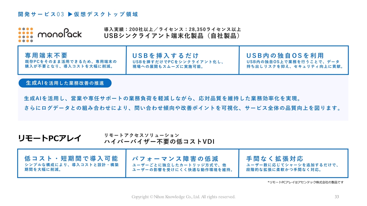 藤井:スライドの「monoPack」は、従来取り組んでいるものの機能性を向上させながら進めています。新しい取り組みとしては「リモートPCアレイ」が挙げられます。これは現在非常に重要視されている、セキュリティ分野に関わる製品です。セキュリティ分野に関わる製品は世の中にさまざまなものがありますが、「リモートPCアレイ」は仮想化技術を活用したシステムで、非常に安価に提供できる点が特徴です。