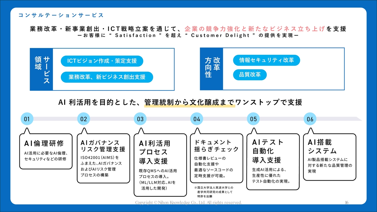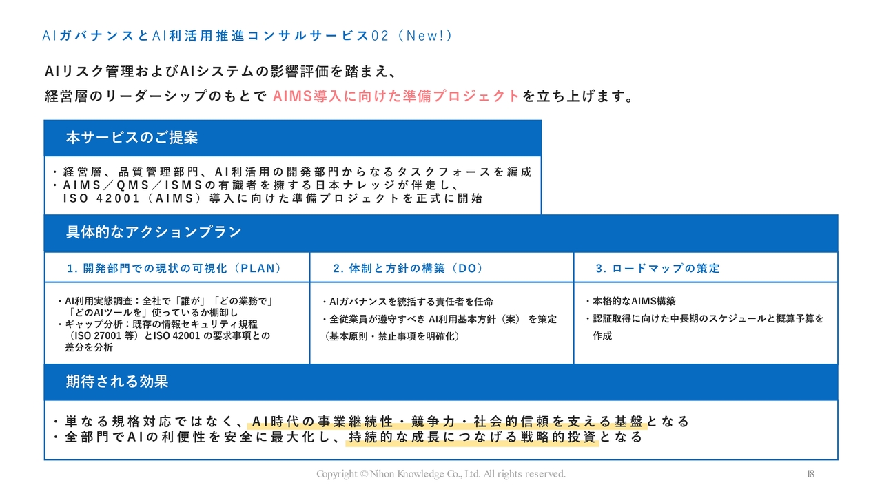 当社は、「ISO/IEC 42001」が制定された時にいち早く情報を入手し、「ISO 9001」の審査員資格に該当する資格を正式に取得しました。現在は2名が資格を保有しており、お客さまがAIを導入し業務に活用したいと考えた際に、上流工程や入口から「ISO/IEC 42001」の制定および認定取得を支援する取り組みを行っています。これはまったく新しい試みであり、他社では行われていないものと思われます。この取り組みは、今年10月からスタートしています。
