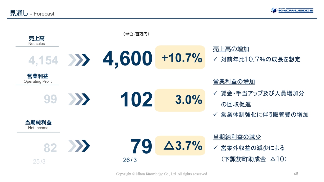 一般管理費においても、人数の増加に伴う間接コストが若干上昇しています。売上原価の前年同期比8.8パーセント増加に加え、販管費の前年同期比1.4パーセント増加を踏まえると、売上高は本来前年同期比10パーセント以上の伸びが必要だと認識しています。ただし、新入社員が多い状況であるため、この点についてはご了承いただければと思います。