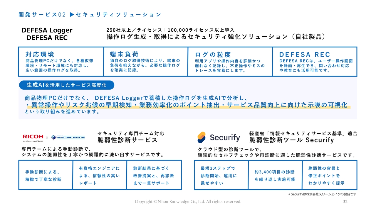 藤井:セキュリティソリューションについてです。新しい内容としては、スライド下段に記載しているとおり、リコーさまと共同で行っている「脆弱性診断サービス」および「Securify」が挙げられます。どちらも情報セキュリティの脆弱性診断に関するものですが、クラウドかオンプレミスかによってターゲットが異なるため、それぞれのシステムに適した脆弱性診断を提供しています。