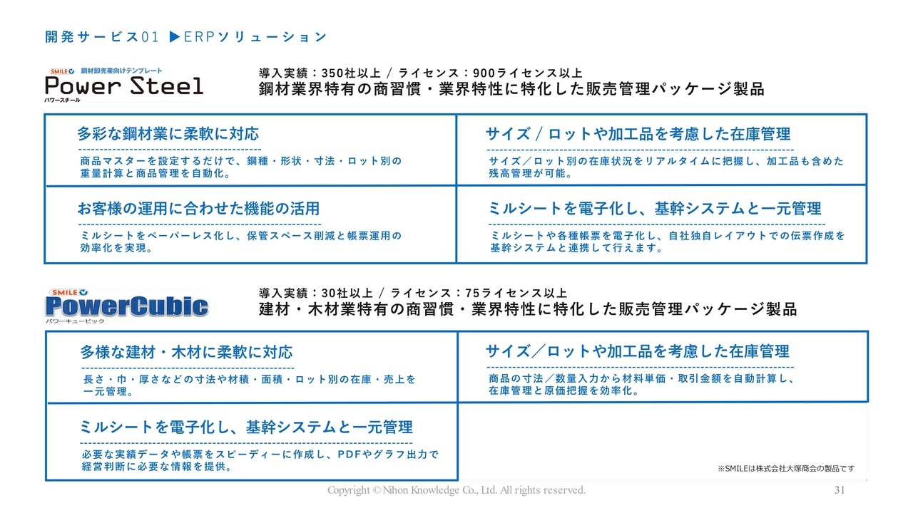藤井:スライドは、ERPに関するテンプレートです。「Power Steel」は、鋼材業向けや木材業向けにバージョンアップしたものを逐次リリースしています。その結果、堅調に推移しています。